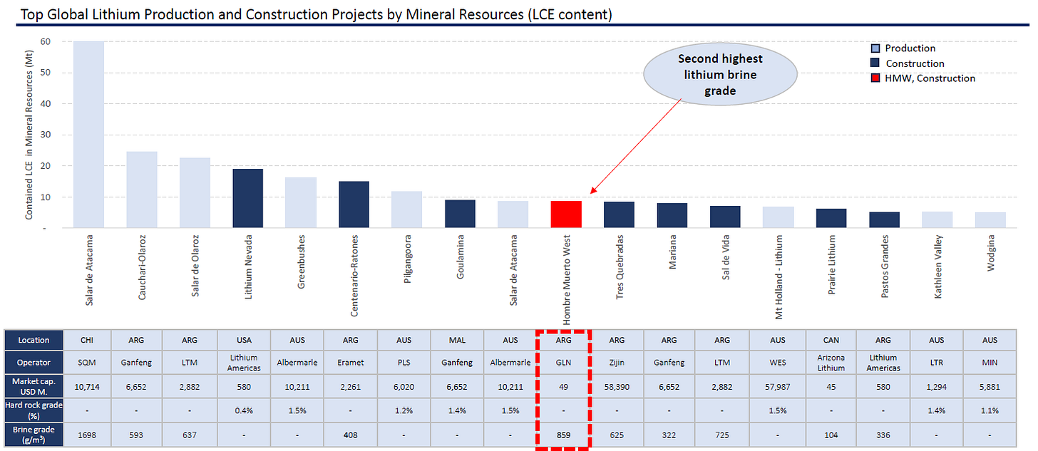 • Hombre Muerto West (HMW): o Measured + Indicated resources: approx. 2.5 Mt LCE o Average grade: ~880 mg/L lithium o Low impurities (Mg/Li < 2), facilitating processing and reducing costs